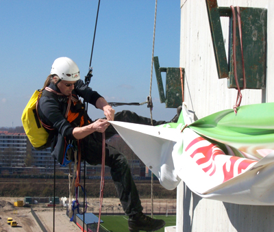 Stunts & Specials: werk & promotie op niveau Larger Than Life biedt evenementen en 'stunts' op hoogte ter promotie van uw bedrijf, als examenstunt of spectaculair feestactiviteit. Zo is het mogelijk om twee klimmers vanaf een dak, raam, balkon etc. een spandoek te laten uitrollen met een reclameboodschap en uw logo. Wij werken volgens industriële klimnormen, met gekeurde materialen en terdege opgeleide klimmers. U kunt uw collega's, leidinggevenden of leerlingen laten abseilen vanaf balkon, kantoor of klaslokaal. Leg uw wensen aan ons voor en wij knopen er een touw aan vast.