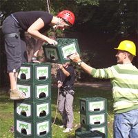 Kratjesklimmen Elke deelnemer bouwt, geholpen door zijn teamgenoten, een hoge toren van kratten terwijl hij met zijn voeten in het bovenste kratje staat. Zodra de maximale hoogte is bereikt, gaat de klimmer er zelf bovenop staan. Hoe hoger de krattentoren, des te meer wankelt hij... De klimmer wordt uiteraard gezekerd door een ervaren instructeur van Larger Than Life. De krattentoren kan wel 20 kratten hoog worden!